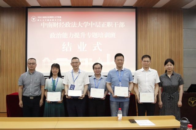 在结业式上,五位学员代表汇报了各组研讨内容。校党委副书记陈狮作总结讲话,他强调,各位中层正职干部作为各单位的“一把手”,要常学常新,坚持用党的创新理论凝心铸魂;要学以致用,推动学习成果转化为高强的政治能力;要明规守纪,始终把讲纪律守规矩摆在首位。最后,校党委副书记陈狮和浙江大学继续教育学院副院长姚青共同为学员代表颁发了结业证书。