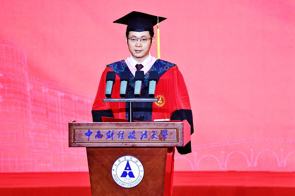 财政税务学院2005届本科、公共管理学院2007届硕士研究生孙铁翔作为校友代表发言。他结合自己的经历,勉励毕业生们努力做一个保持初心、远离浮躁的人,一个心存热爱、拒绝焦虑的人,一个坚韧不拔、不惧风雨的人。