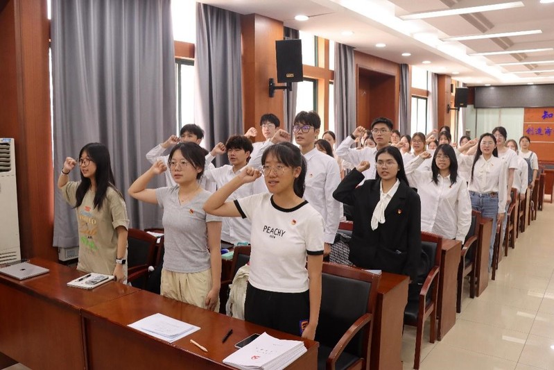 三位党员老师为新接收的预备党员授戴党徽后,全体人员面对着鲜红的党旗,郑重地举起了右拳,以庄严的宣誓表达对中国共产党的忠诚、为共产主义事业奋斗终身的决心。