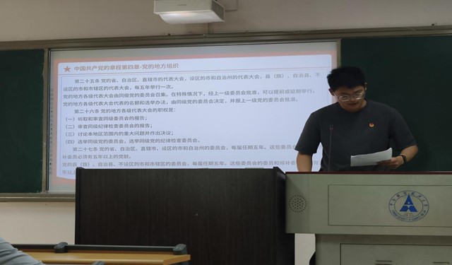 本次党日活动共分为六部分,分别为王生才同学领学《中国共产党章程》和新修订《中国共产党纪律处分条例》,张依鑫同学领学《论党的自我革命》(节选),郑玲萍同学领学《大力弘扬教育家精神 为强国建设民族复兴伟业作出新的更大贡献》,傅玲珑同学领学《奋力书写为中国式现代化挺膺担当的青春篇章》,本科2020级党员导航以及组织全体入党积极分子观看诚信主题教育视频。活动现场,入党积极分子们热情高涨,积极参与,进一步坚定了对党的忠诚和信仰。
