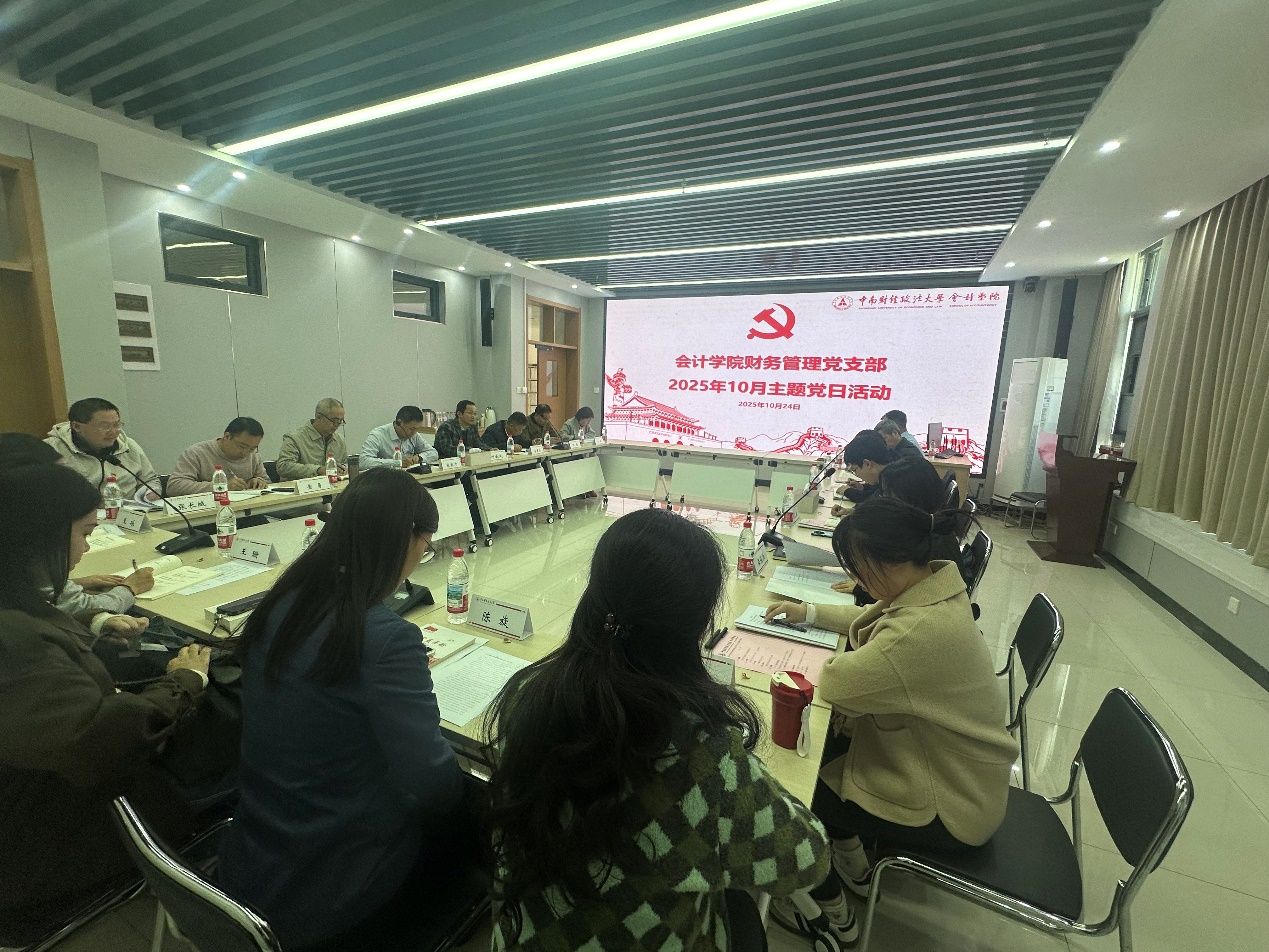 2025年10月24日下午,会计学院财务管理党支部在文瀚楼北408会议室举行10月主题党日活动暨集中大课交流研讨活动。学校党校教务长兼党委组织部副部长伍施乐、会计学院党委书记周勇到会指导。