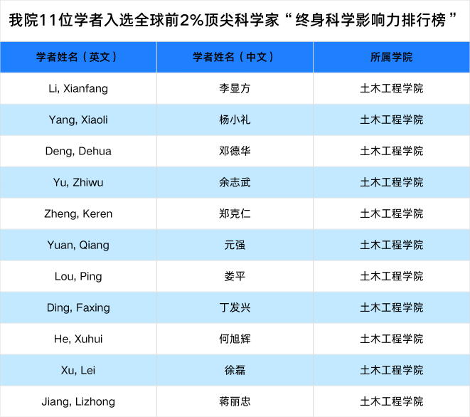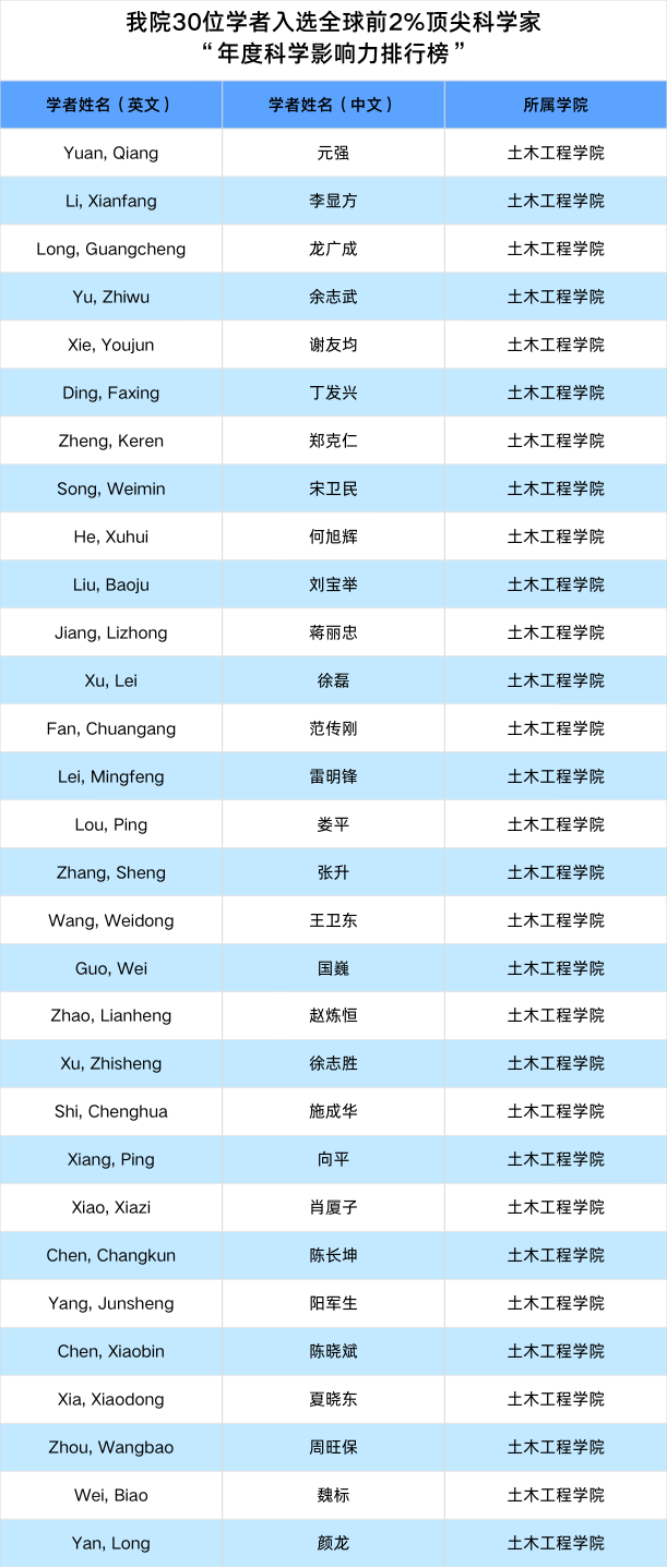 在衡量学者长期贡献的“终身科学影响力排行榜”中,土木工程学院李显方,杨小礼,邓德华,余志武,郑克仁,元强,娄平,丁发兴,何旭辉,徐磊,蒋丽忠等教师入选。