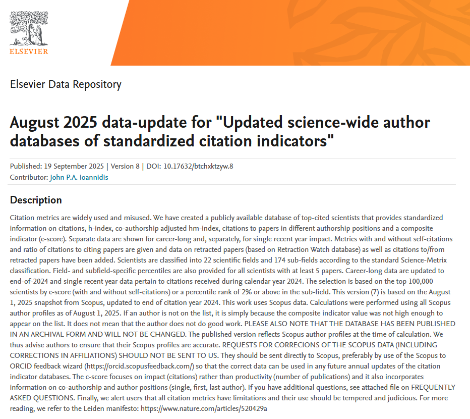 据悉,该榜单分为“终身科学影响力排行榜”和“年度科学影响力排行榜”两大部分,基于Scopus数据库中近700万名科学家的学术数据,通过多项引用指标进行系统评价,包括论文引用量、H指数、合著调整后的HM指数、单独或第一作者的文章引用数等,最终遴选出世界排名前2%的顶尖学者,涵盖22个领域和174个子领域。
