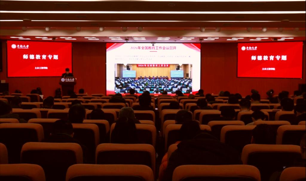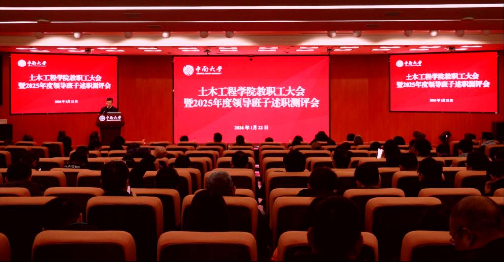 1月22日下午,中南大学土木工程学院在天心校区梅园报告厅召开教职工大会,进行学院领导班子和领导干部2025年度述职考核,校党委组织部副部长郭飒飒到会指导。会议由学院党委副书记纪晓飞主持。