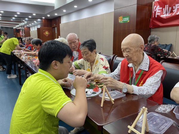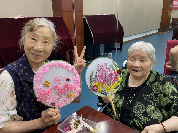 针对该养老院大部分老年人不同程度失能失智,同时,长期被保护、被照顾而缺乏运动康复训练的现状,结合重庆夏季炎热、老年人习惯用扇子消暑的特点,志愿者为老年人带来了手工干花扇DIY活动。志愿者通过视频讲解和实际操作演示向老年人说明了手工干花扇的具体制作过程,强调在这个过程中如何训练手眼协调能力。伴随着轻松愉快的音乐和说笑声,老年人们跟着志愿者的讲解动起来:手拿镊子,夹满天星放在扇子左边,再用胶水固定……老年人们像雕刻艺术作品一样用心装饰着扇子。针对视力不好、手部精细动作退化的老年人,志愿者充分利用专业知识,用鼓励、协作等方式,帮助老年人在制作中寻找到生活的快乐和意义。当老年人们欣赏着自己的作品时,脸上露出满满的成就感。该院院长陈春祥表示,作业治疗志愿服务活动不仅提高了失能失智老年人手部灵活性,帮助老年人开动大脑、积极思考,还有助于老年人心理健康。