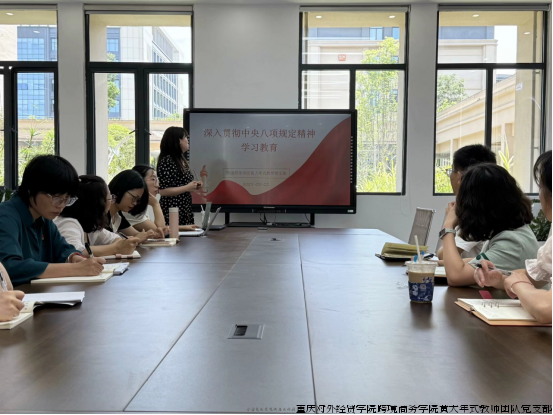 5月22日,跨境商务学院黄大年式教师团队党支部开展了深入贯彻中央八项规定精神学习教育。此次学习教育旨在助力党员教师全面且深入地领会中央八项规定的出台背景、深远意义,以及落实其精神的具体要求,进而强化党性修养,提升党风廉政建设成效,确保中央八项规定精神在日常教学与管理工作中落地生根。