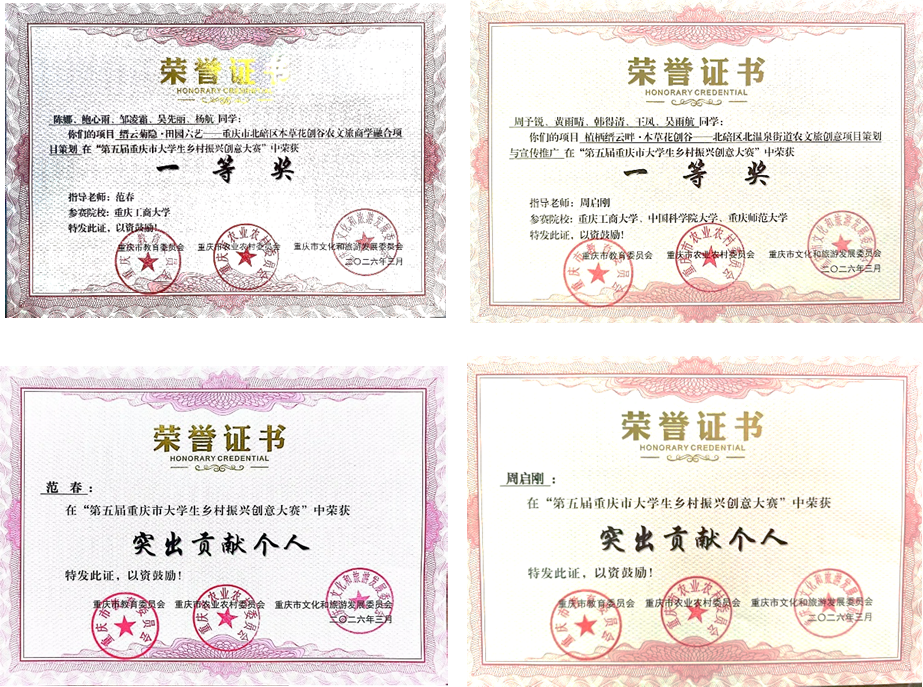 支部党员老师带领学生在“以赛促学”理念引领下,将专业理论与服务乡村振兴实践深度融合,取得突出成绩。支部党员老师指导学生共斩获5项大奖,其中一等奖1项、二等奖3项、三等奖1项。其中,周启刚老师指导的《植栖缙云畔·本草花创谷》获一等奖;蔡进老师指导的《缙云野菊谷·东篱疗愈乡》和《北碚溢彩,“菊”市闻名》分获二等奖;毕国华老师指导的《碚畔菊香萦雅宿,振兴乡野共悠游》获二等奖;龚杰老师指导的项目获三等奖。