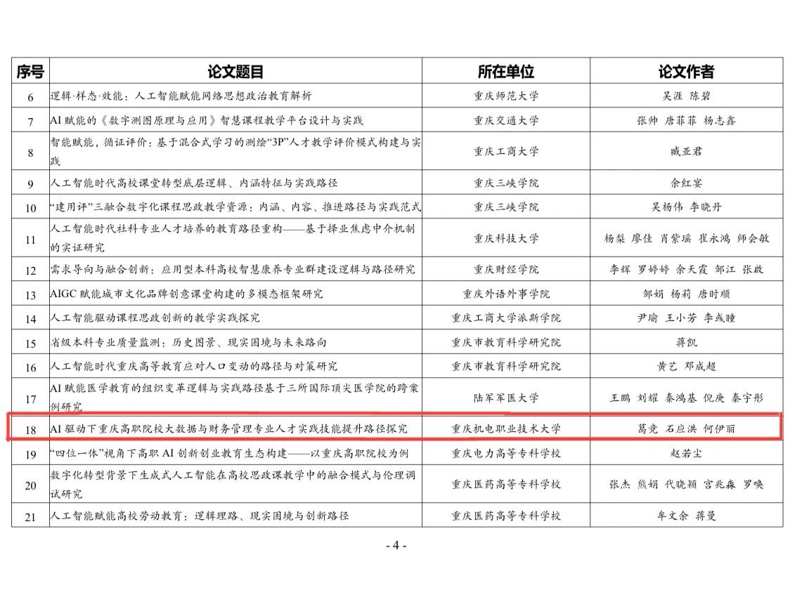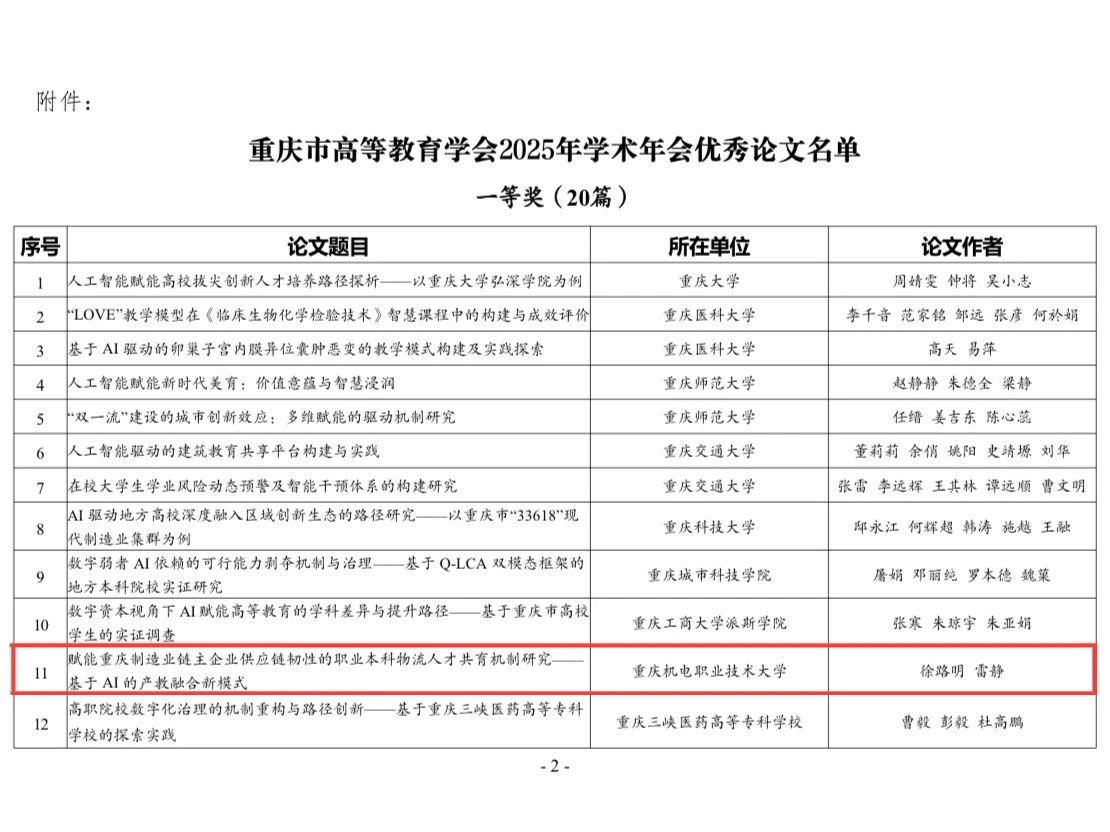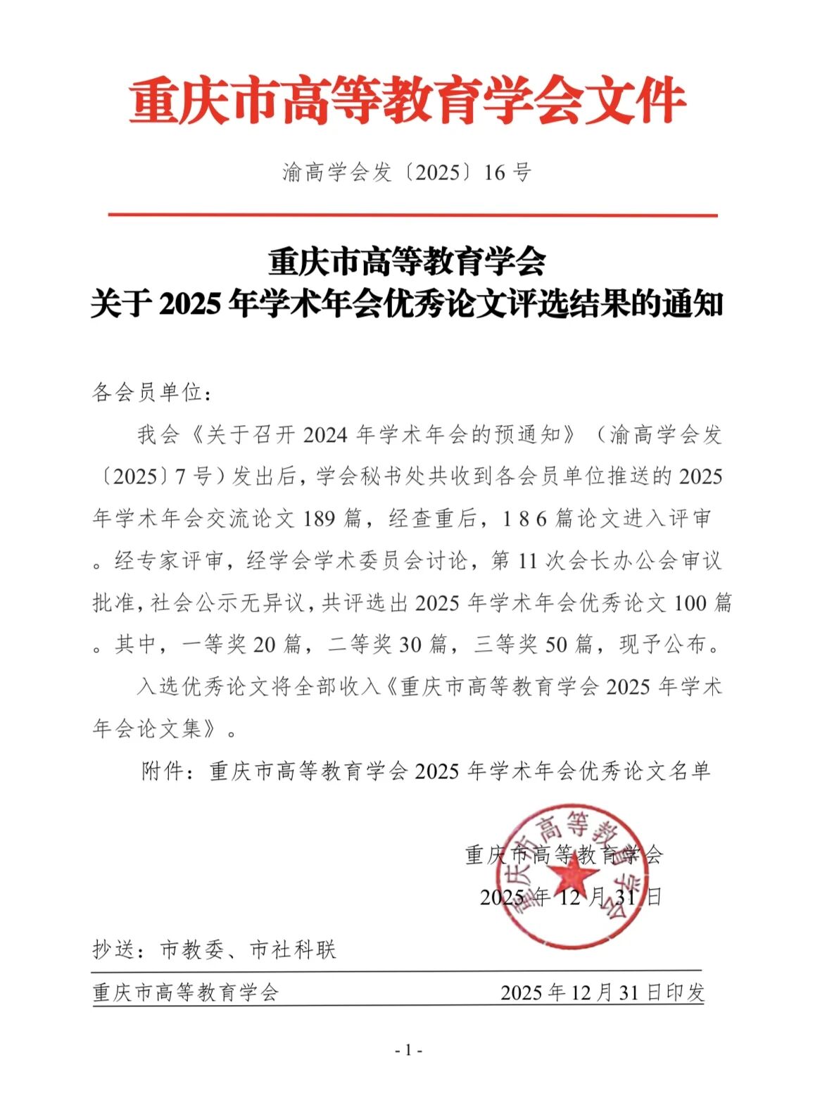 2025 年重庆市高等教育学会学术年会论文评选中,重庆机电职业技术大学经济与管理学院四位老师的两篇论文分获一、二等奖。