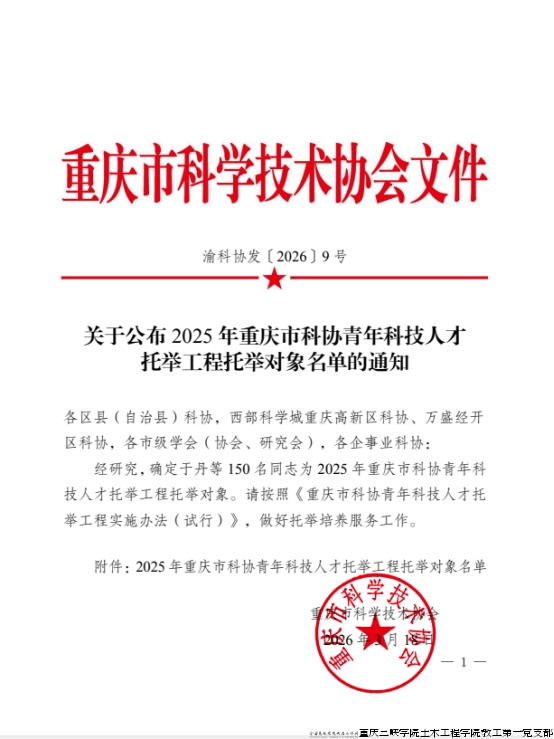 2026年3月18日,重庆市科协公布青年科技人才托举工程托举对象,土木工程学院教工第一党支部书记唐鑫入选重庆市科协青年科技人才托举工程。