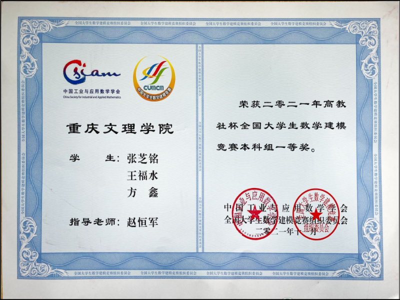 竞逐挑战,捷报频传。2020年以来,重庆文理学院数学与人工智能学院学子在国内学科竞赛赛场、在各类高水平学科竞赛中斩获省部级以上奖励839项,其中国家级奖励313项,省部级奖励526项,参赛学生覆盖全院所有8个专业,形成了层次分明、种类齐全、成果丰硕的赛事育人新格局。其中,标志性成果亮点纷呈:邱鑫、熊柯同学团队在第七届中国国际“互联网+”大学生创新创业大赛全国总决赛中荣获金奖;张芝铭、王福水、方鑫同学团队在第二十九届高教社杯全国大学生数学建模竞赛全国总决赛中荣获本科组一等奖;邓益丹、崇泽文、吴文杰同学团队在第五届华为ICT大赛全球总决赛云赛道荣获一等奖;张维同学在第五届全国师范生微课大赛中斩获特等奖......