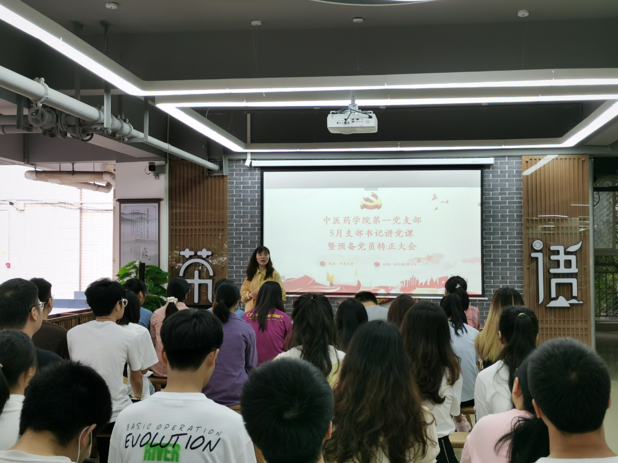 中医药学院第一党支部支部书记讲党课暨预备党员转正大会于2022年5月31日在竹苑大厅开展,学习习近平总书记庆祝中国共产主义青年团成立100周年大会上的重要讲话,并传达相关会议精神。支部书记周恒老师主持会议。