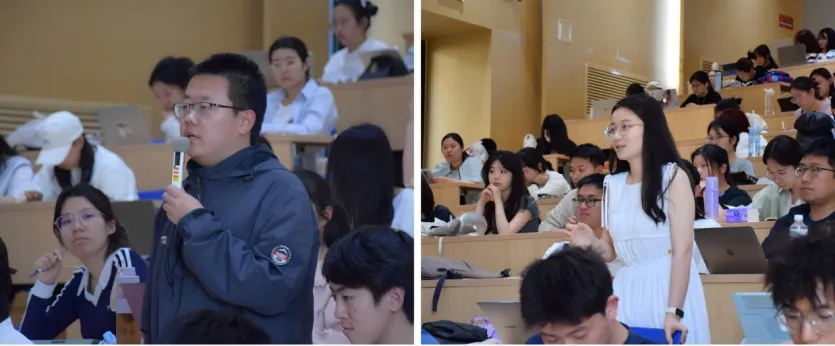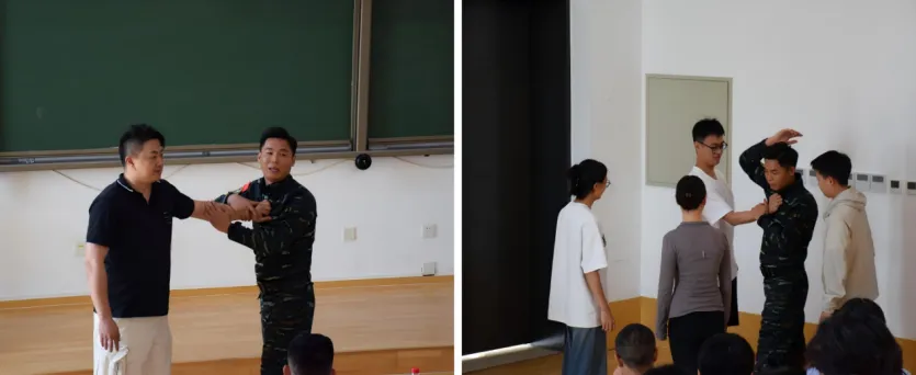 在互动环节中,陈延峰现场教学简易正当防卫技巧,邀请同学互动体验,教学氛围紧张有序又不失趣味。通过一问一答、生动的讲解与实践,提升了同学们的应急防护意识和基本技能。
