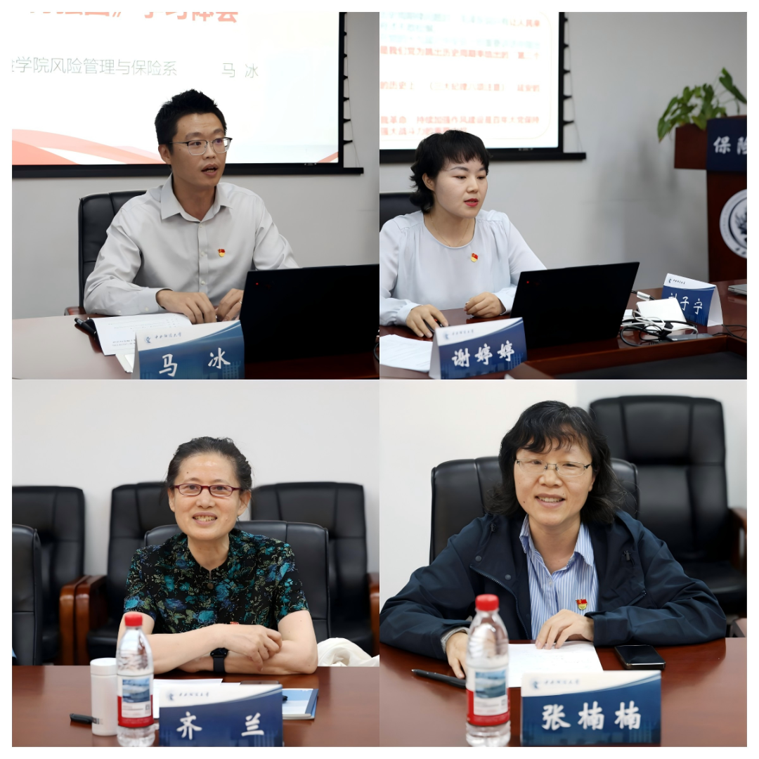 在交流环节,经济学院齐兰教授表示作为高校党员教师同时肩负政治使命和职业责任,要常怀敬畏之心,坚决落实立德树人使命。保险学院张楠楠副教授讲到支部党建业务双融合的工作体系以及下一步工作方向。