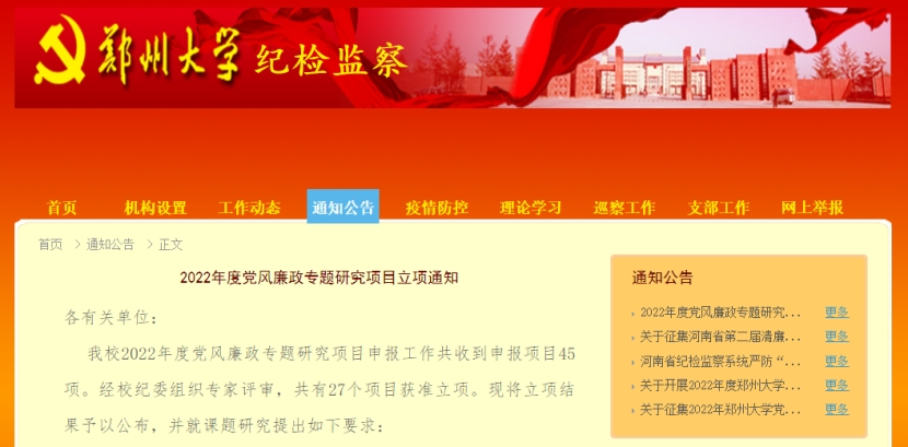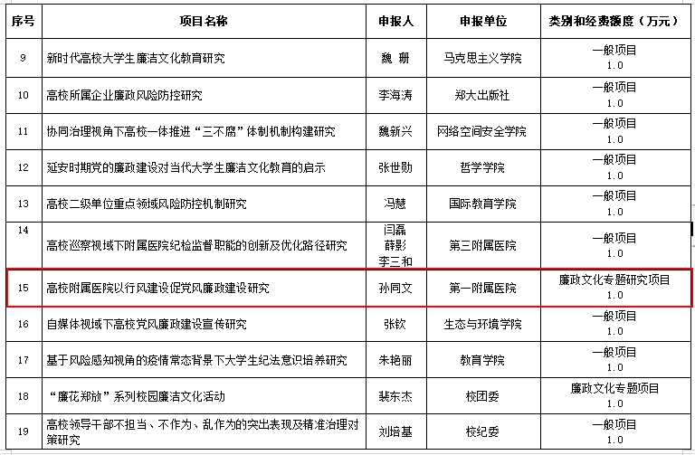 近日,中共郑州大学纪律检查委员会公布郑州大学2022年度党风廉政专题研究项目立项结果。共有45项申报项目,经校纪委组织专家评审,最终有27个项目获准立项。郑州大学一附院医技总支急诊党支部书记孙同文申报的《高校附属医院以行风建设促党风廉政建设研究》获批廉政文化专题研究项目。