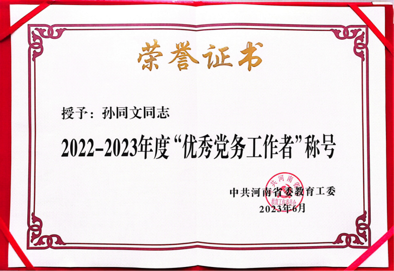 近日,中共河南省委教育工委下发《中共河南省委教育工委关于委属学校优秀共产党员、优秀党务工作者、先进基层党组织拟表彰对象的公示》,郑州大学第一附属医院医技总支急诊党支部孙同文同志荣获2022-2023年度“优秀党务工作者”称号。