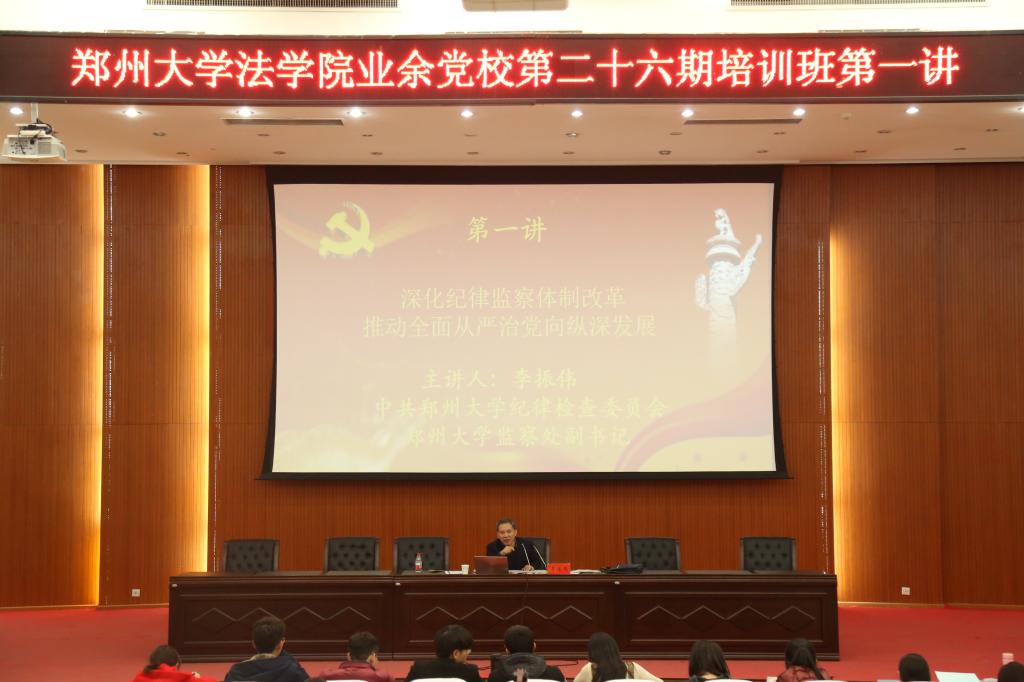11月29日晚,法学院业余党校第二十六期培训班第一讲在模拟法庭正式开讲。本期党课第一讲以“深化纪检监察体制改革,推动全面从严治党向纵深发展”为主题,主讲人为郑州大学校纪委李振伟副书记。