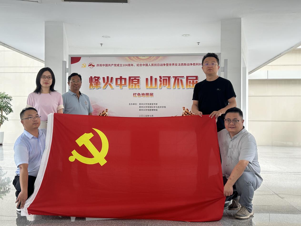 为庆祝中国共产党成立104周年,纪念中国人民抗日战争暨世界反法西斯战争胜利80周年,传承弘扬革命精神,赓续红色血脉,7月8日上午,考古与文化遗产学院考古学系教工党支部组织参观了由郑州大学党委宣传部、地球科学与技术学院、地图博物馆举办的“烽火中原 山河不屈”红色地图展。教工党支部书记周亚威、副书记田成方,支部委员张建、常乐以及支部成员赵海洲老师等参加活动。