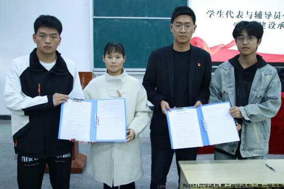 仪式中,学生代表分别与辅导员燕永敏、魏屹郑重签署了《学风建设承诺书》。这一环节不仅体现了学生自觉践行优良学风的决心,也展现了师生携手、共同推进学风建设的良好氛围。