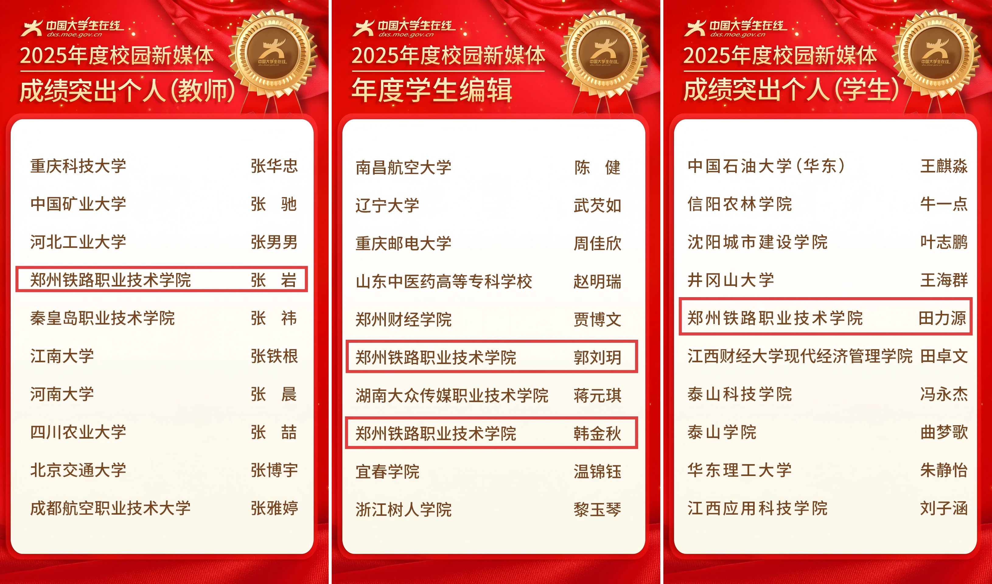 1月8日,教育部中国大学生在线公布2025年度校园新媒体表彰名单,我校荣获“2025年度校园新媒体互动百强单位”和“2025年度校园新媒体联合培养突出贡献单位”荣誉称号。我校张岩老师获评“2025年度校园新媒体成绩突出个人(教师)”,田力源、郭刘玥、韩金秋3名学生分别获评“2025年度校园新媒体成绩突出个人(学生)”和“2025年度校园新媒体年度学生编辑”荣誉称号。这一系列成果,标志着我校新媒体矩阵建设和网络思政育人实践获得国家级平台的充分肯定。